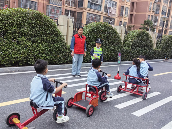 活动中,志愿者用充满童趣的语言,将交通规则故事化:人行横道是“斑马伯伯的安全带”、红绿灯是“路口的指挥家”,还结合动画短片与互动问答,让孩子们快速掌握交通标志作用及“红灯停、绿灯行”等常识。随后的“模拟交通”环节,孩子们分别扮演“小交警”“小行人”“小司机”,在操场“十字路口”沉浸式体验交通场景。整个模拟现场秩序井然又充满童真,抽象的交通规则在亲身体验中内化为自觉的文明行为。