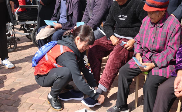 早晨八点,医疗团队与志愿者们如约而至,迅速投入老人服务工作。医务人员俯身细语,一边为老人测量血压、血糖,一边耐心倾听他们的健康诉求。老人体检结束后,志愿者们将一双双崭新的鞋子送到老人们手中,细心帮他们试穿、调整尺码。穿上新鞋的张奶奶开心地来回走动,连声说:“合脚,真合脚!入院这么多年还是头一回有人给我试鞋呢。”活动现场,老人们脸上都绽开了笑容。