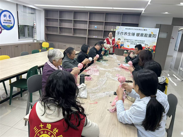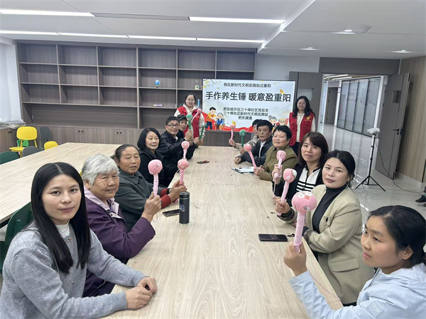 肥东经开区三十埠社区新时代文明实践站以“手作养生锤 暖意盈重阳”为主题,让老人们在手工制作中感受节日关怀。志愿者手把手指导,从挑选布料到填充艾草,每一步都耐心协助。“这个艾草锤是我亲手做的,打在背上又舒服又解乏!”随着一把把艾草养生锤完工,老人们互相为彼此捶打肩膀、腰背,清脆的笑声与艾草的清香交织,成了重阳最温馨的画面。