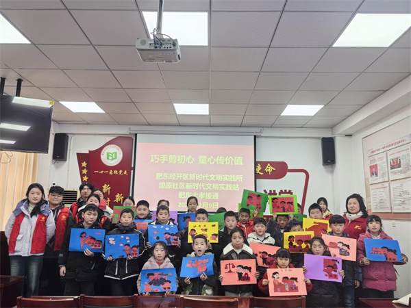 2月9日上午,肥东经开区燎原社区活动室内充满欢声笑语,一场主题为“巧手剪初心 童心传价值”的非遗剪纸活动正在这里举行。活动现场,大学生志愿者首先为孩子们讲述了剪纸艺术的历史渊源和文化寓意,展示了精美作品。随后,在志愿者的耐心指导下,孩子们拿起红纸和剪刀,从折叠到剪刻,一步步学习基本技法。虽然手法稚嫩,但每个人都全神贯注,不一会儿,一幅幅包含五角星、灯笼、爱心等元素的剪纸作品逐渐在手中呈现。活动将传统剪纸与时代主题巧妙结合,让孩子们在动手实践中,既领略了非遗之美,又加深了对国家象征、传统美德和核心价值观的具象化理解。