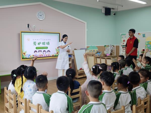 活动中,医务人员针对幼儿活泼爱动的特点,通过讲故事、PPT、护眼操等形式,为孩子们生动讲解怎样预防近视和爱护眼睛等实用知识。并给同学们提供了有效预防近视的“小妙招”。志愿者也呼吁小朋友正确对待近视、科学用眼、养成良好的用眼习惯。并强调适量的户外活动和阳光照射对儿童视力保护至关重要,倡议小朋友们每天保证足够的户外活动时间。