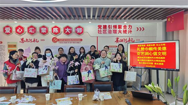 肥东经开区陈大郢社区新时代文明实践站开展“礼赞巾帼传美德 花艺润心倡文明”妇女节主题活动。活动中,大家在专业老师的指导下体验巴特包手工制作,将花草图案巧妙拓印在环保帆布袋上,创作出独一无二的专属作品。社区还为每位参与者送上象征纯洁美好的百合花,让大家在欢声笑语中度过一个温馨又有意义的节日。